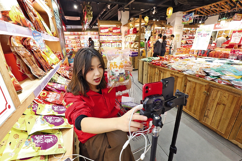 11月13日,在位于重庆市沙坪坝区的重庆磁器口的陈麻花有限公司一门店,网络直播人员正在进行直播带货。今年以来,重庆磁器口陈麻花有限公司累计享受各类稳岗就业补贴约29.56万元。借助稳岗补贴,该公司新招用5名直播带货主播,组建共有23人的电商直播团队,带动公司整体销售额提升了10%。