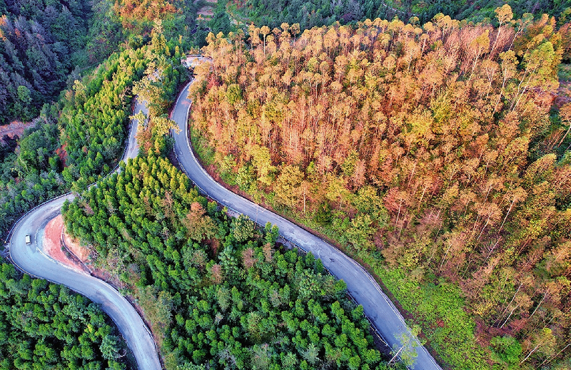 11月15日,贵州省黔东南苗族侗族自治州从江县四寨河口至高增乡占里村旅游公路沿线,山林色彩斑斓,红叶似火,层林尽染,风景如画。