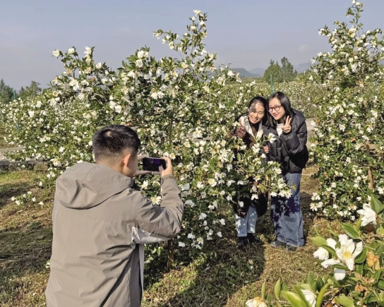 “听说歧坪红杨村这边有一大片油茶树,可以看到‘花果同株’的景色,所以今天和朋友特意来打卡拍照。漫山的白花像下雪一样,还能看到挂满枝头的果子,既能赏景又能体验乡村风情,不虚此行。”游客黎彦君说道。