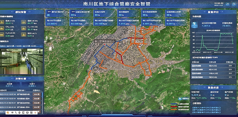 在大力开展更新的同时,南川区同样注重依靠科技赋能和机制创新,提升管线管理的精细化、智能化水平,数字建设成果显著。2025年,南川区完成了城区21.2平方公里范围内供水、排水、燃气等管线矢量化数据归集,累计长度达1395.76公里,建成智能化管理平台,实现管网“一张图”智慧管理。地下综合管廊安全智管场景投入运行,实现安全态势“一屏统览”。