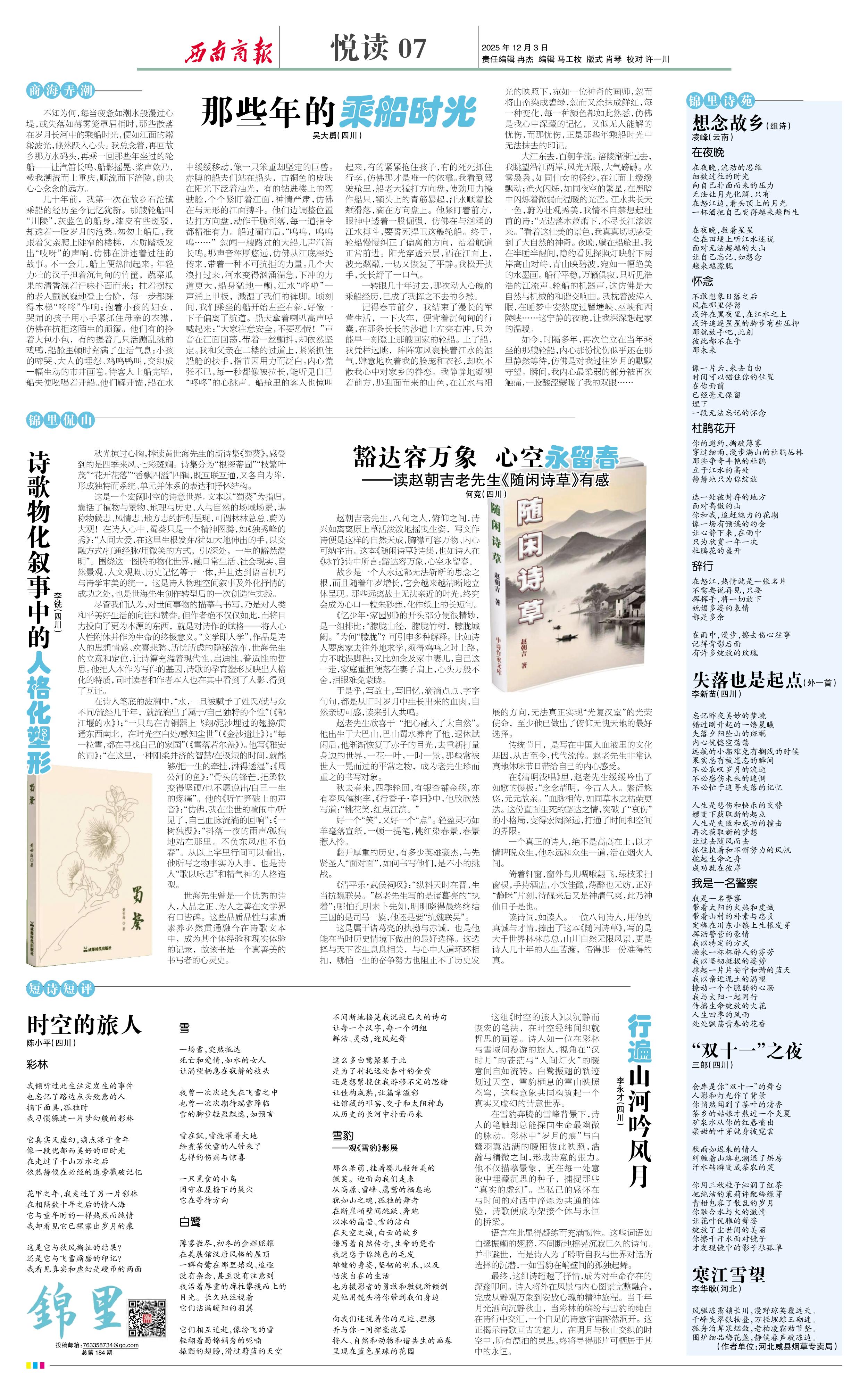 在诗人笔底的波澜中,“水,一旦被赋予了姓氏/就与众不同/流经几千年,就流淌出了属于/自己独特的个性”(《都江堰的水》);“一只鸟在青铜器上飞翔/泥沙埋过的翅膀/贯通东西南北,在时光空白处/感知尘世”(《金沙遗址》);“每一粒雪,都在寻找自己的家园”(《雪落若尔盖》)。他写《雅安的雨》:“在这里,一种刚柔并济的智慧/在极短的时间,就能够/把一生的牵挂,淋得透湿”;《周公河的鱼》:“骨头的锋芒,把柔软变得坚硬/也不愿说出/自己一生的疼痛”。他的《听竹笋破土的声音》:“仿佛,我在尘世的喧闹中/听见了,自己血脉流淌的回响”;《一树独樱》:“抖落一夜的雨声/孤独地站在那里。不负东风/也不负春”。从以上字里行间可以看出,他所写之物事实为人事,也是诗人“歌以咏志”和精气神的人格造型。