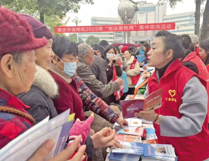 潼南区总工会工作人员围绕宪法核心精神,结合《中华人民共和国工会法》《中华人民共和国劳动法》《保障农民工工资支付条例》等重点法律法规,向过往职工群众发放维权手册、普法宣传单等资料,针对老年职工、新就业形态劳动者等不同群体的需求,工作人员耐心解答各类咨询,共发放宣传资料400余份,覆盖职工群众超600人,让普法宣传更接地气、更具温度,切实将工会“娘家人”的法治关怀送到了职工心坎上。同时,工作人员还推广“12351”职工服务热线,引导职工群众“遇事找法、解决问题用法”。