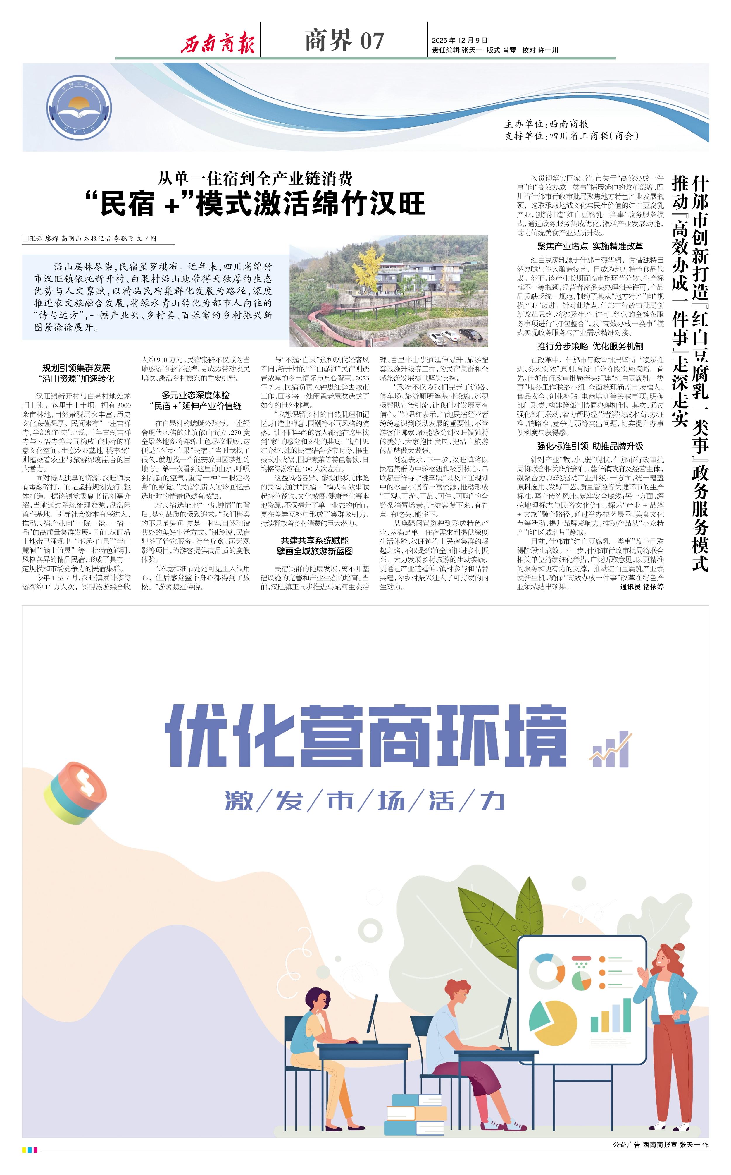 从唤醒闲置资源到形成特色产业,从满足单一住宿需求到提供深度生活体验,汉旺镇沿山民宿集群的崛起之路,不仅是绵竹全面推进乡村振兴、大力发展乡村旅游的生动实践,更通过产业链延伸、镇村参与和品牌共建,为乡村振兴注入了可持续的内生动力。