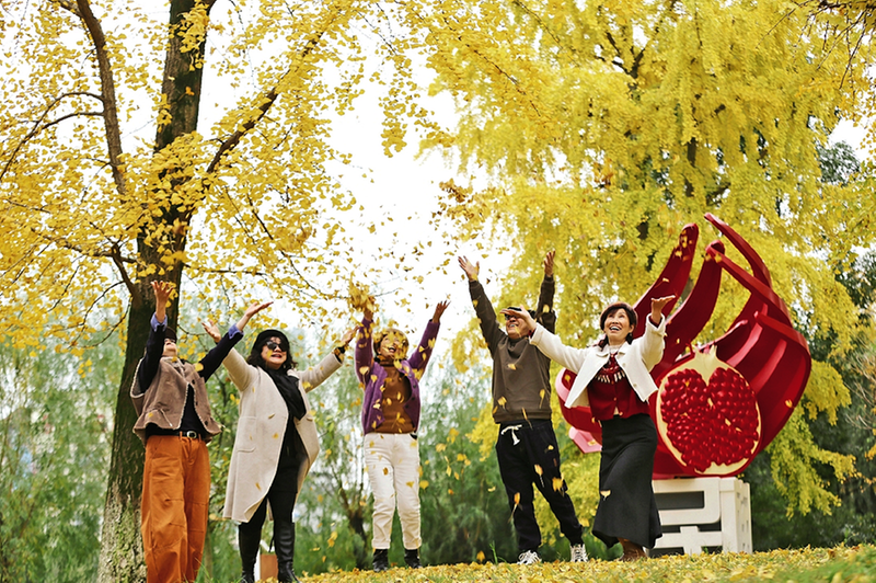 12月6日,四川省乐山市新广场石榴籽家园内,银杏一片金黄,美不胜收,吸引不少市民前来游玩。