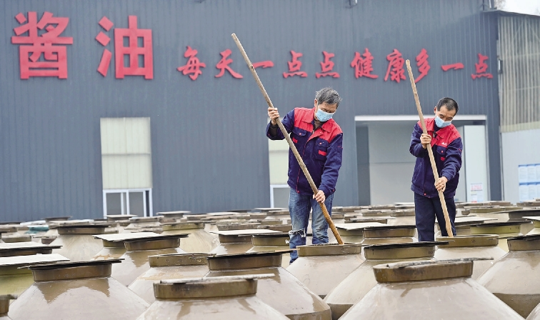 12月17日,在四川省内江市东兴区双桥镇华资美天食品有限公司的露天晒场上,工人们正在酱油晒缸前翻晒酱醅。
