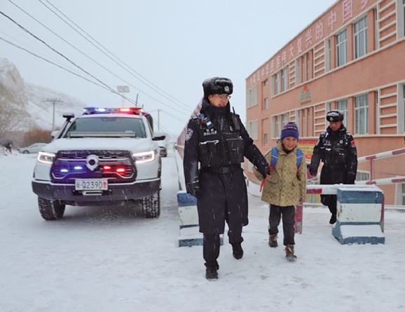 民警们帮助小学生抵达安全路段 12月22日,帕米尔高原深处的瓦恰乡迎来一场强降雪,天地间银装素裹,道路积雪湿滑,给辖区群众出行带来了不小挑战。为确保恶劣天气下校园绝对安全、学生平安上下学,新疆出入境边防检查总站喀什边境管理支队瓦恰边境派出所积极响应上级“冬季暖阳”专项行动号召,顶风冒雪,及时组织警力前往瓦恰乡小学开展护校安园工作,用一抹温暖的“藏蓝”筑牢雪天校园安全屏障。