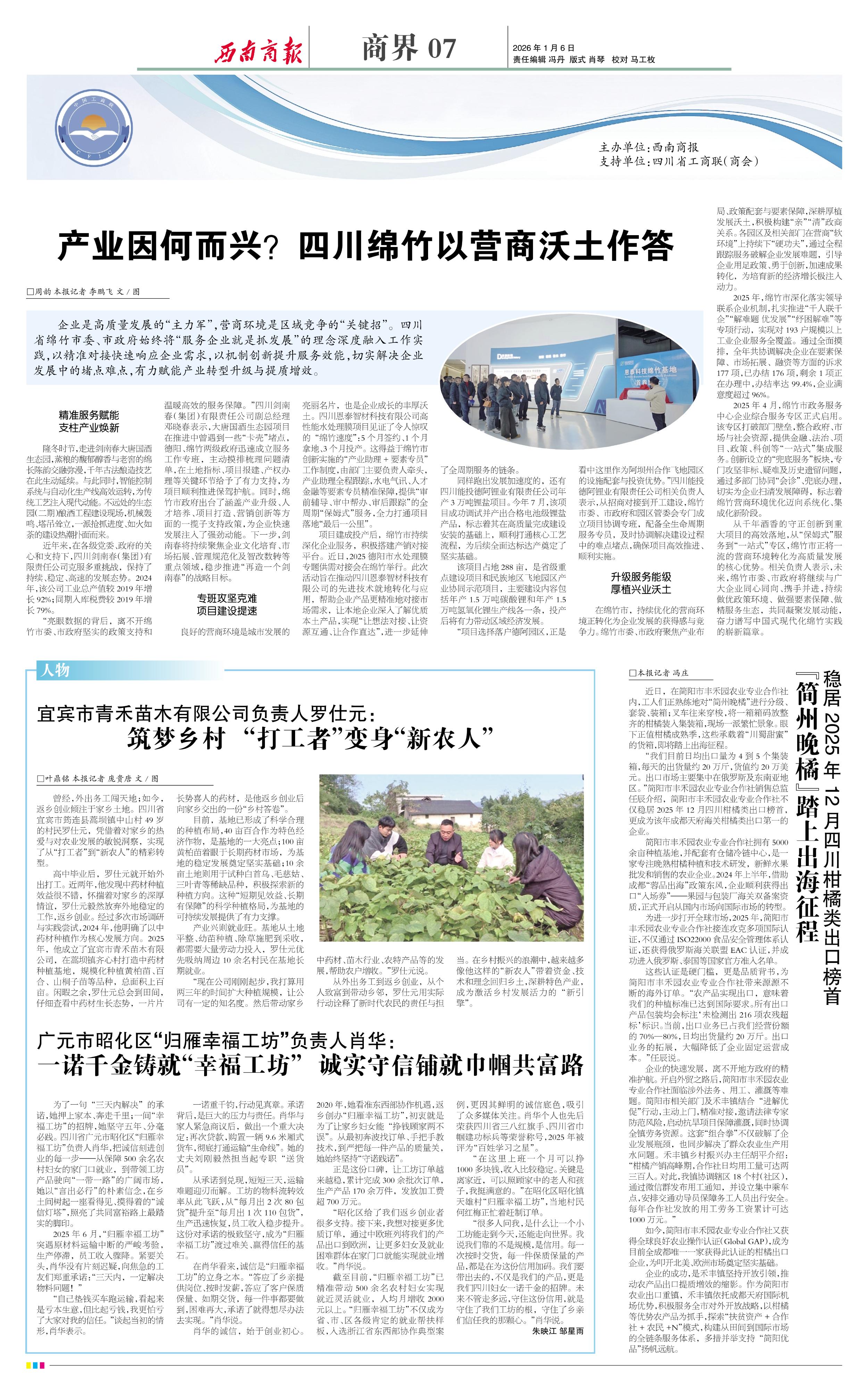 企业的快速发展,离不开地方政府的精准护航。开启外贸之路后,简阳市丰禾园农业专业合作社面临涉外法务、用工、灌溉等难题。简阳市相关部门及禾丰镇结合“进解优促”行动,主动上门,精准对接,邀请法律专家防范风险,启动抗旱项目保障灌溉,同时协调全镇劳务资源。这套“组合拳”不仅破解了企业发展瓶颈,也同步解决了群众农业生产用水问题。禾丰镇乡村振兴办主任胡平介绍:“柑橘产销高峰期,合作社日均用工量可达两三百人。对此,我镇协调辖区18个村(社区),通过微信群发布用工通知,并设立集中乘车点,安排交通劝导员保障务工人员出行安全。每年合作社发放的用工劳务工资累计可达1000万元。”
