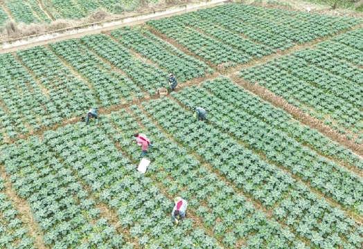 冬日暖阳洒在仙临镇的田野上,一株株长势喜人的羽衣甘蓝绿意盎然、生机勃勃。大像家庭农场的种植基地里,农户们正忙着采摘,一派繁忙的丰收景象。