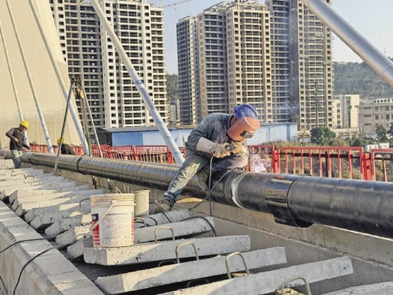 寒冬时节,在三清大桥桥面施工的轰鸣声中,DN300供水主管网铺设作业同步开展,呈现出“桥管并行、双线攻坚”的忙碌景象。施工人员身着工装、不畏严寒,有的专注地进行管道预制拼接,精准把控每一处接口的密封性;有的操控吊装设备,平稳吊运预制管道至指定点位;有的俯身细致地检查管道安装精度,用严谨态度筑牢质量防线。