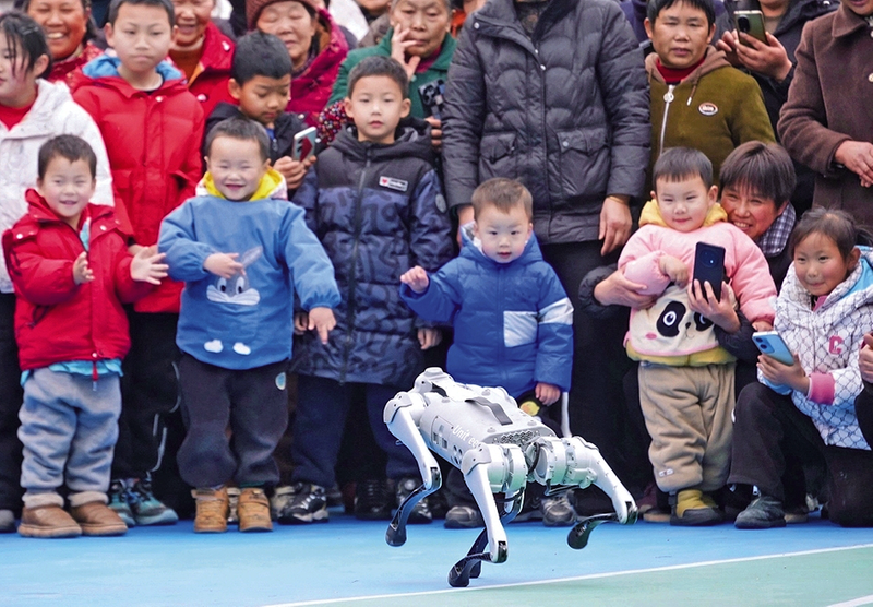 1月17日,四川省巴中市通江县麻石镇中心小学操场上,学生们与机器狗在校园里互动。