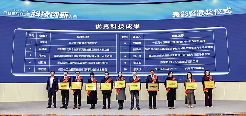 为树立创新典范、激励全员奋进,大会对2025年度科技创新先进集体和个人进行表彰,其中获“优秀科技成果奖”的10项成果尤为引人注目,成为学校科研实力的集中彰显。