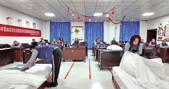 走进霍城县水定镇其宁巴克社区、团结社区客房服务培训班,学员们正认真学习酒店客房标准化服务流程。讲师通过实操示范、手把手纠错的方式,详细讲解了客房清洁规范、用品摆放标准、应急事件处置等核心技能,学员们分组演练,现场一派热火朝天的学习景象。