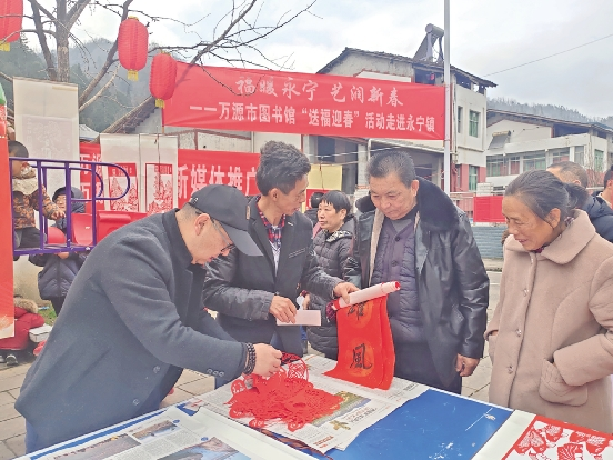 岁末冬寒,年味渐浓。为深入传承中华优秀传统文化,扎实推进文化惠民工程,让基层群众在非遗魅力中喜迎 2026 年新春,1月31日,四川省万源市图书馆“送福迎春”系列活动走进永宁镇,将200余幅饱含匠心与祝福的手工剪纸“福”字免费赠予当地市民,用一张红纸、一把剪刀串联起文化温情与新春期盼,为山村小镇增添了浓厚的节日氛围。