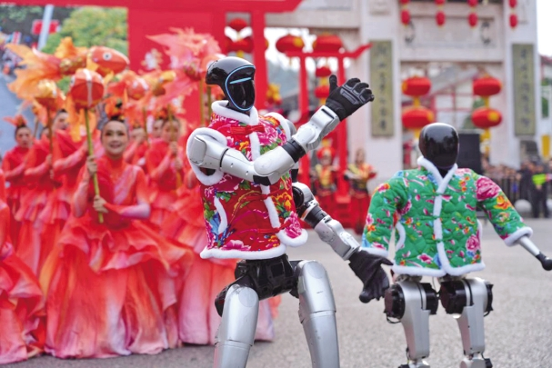 德阳经开区将前沿科技与传统民俗巧妙融合,巡游队伍中,多台智能机器人身穿大花袄惊艳亮相,它们或与演员共舞,或与观众互动,现代元素的加入让传统表演焕发新意,引得孩子们欢呼雀跃;旌阳区以德孝文化为魂,携孝泉上九会民俗方阵与创新IP旌阳文旅吉祥物“旌湾湾”和“美塔塔”热闹共舞,机器狗与“篮球小哪吒”们惊喜同台。
