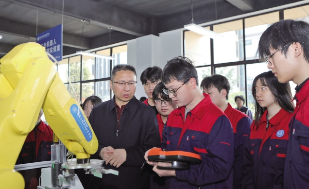 宣讲前,傅国涛走进该校智能制造实训中心,将全国两会精神从“云端”带到“一线”。他来到正在操作设备的师生中间,示范工业机器人的操作技巧,分享多年总结的通过微小改进突破加工极限的宝贵经验。