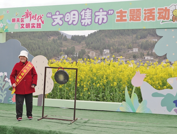 在热烈的掌声中,四川省道德模范王仕蓉敲响铜锣,宣布“文明集市”正式开市。围绕文明行为规范、反诈知识等内容开展的有奖问答同步启动,村民们争相抢答,现场气氛活跃。