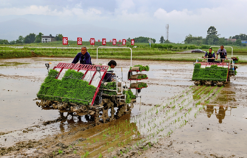 4月15日,在四川省华蓥市华龙街道东方村粮油生产基地,农民驾驶插秧机在被春雨蓄满了水的农田插秧。