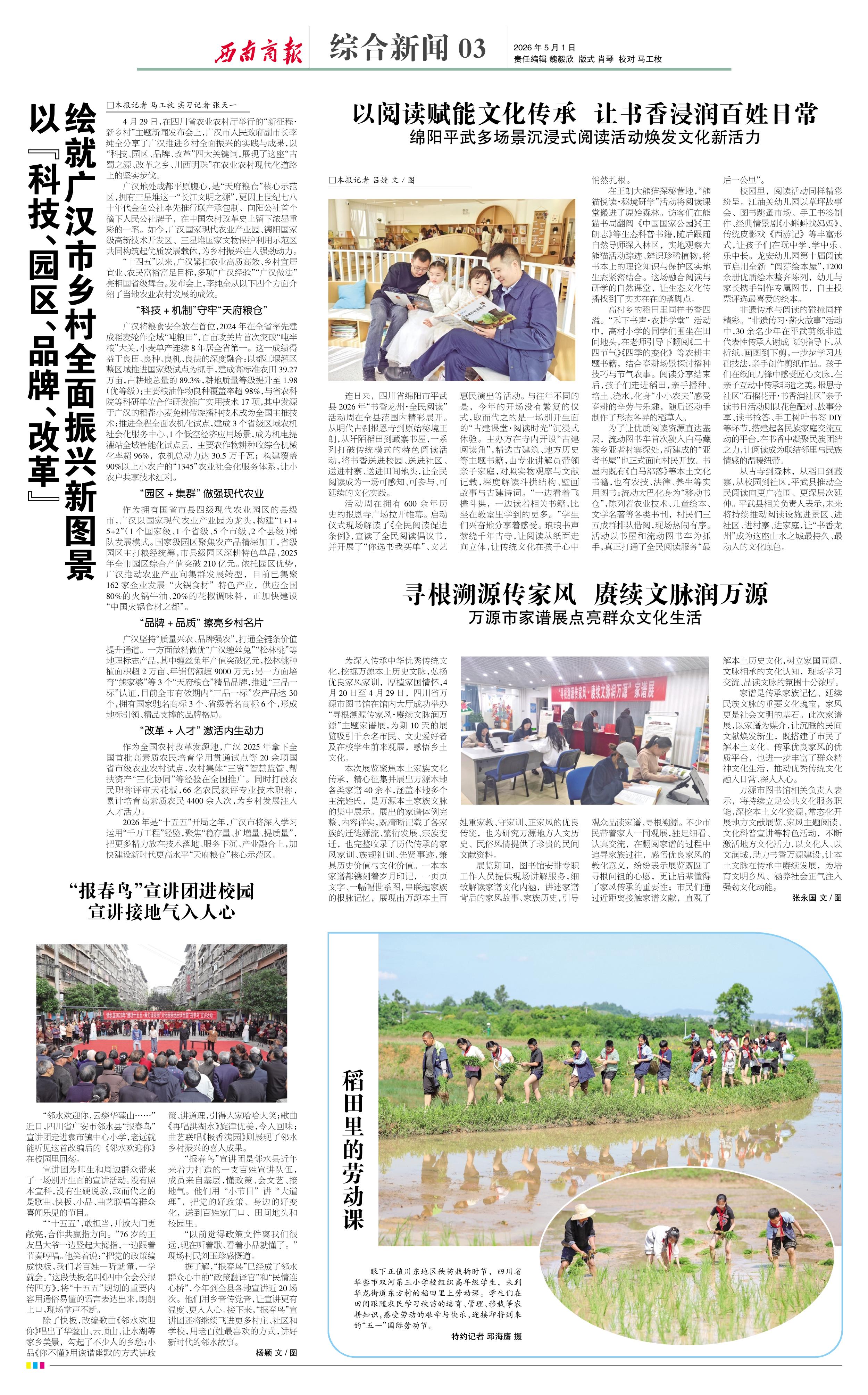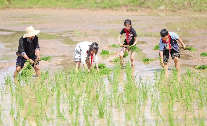 眼下正值川东地区秧苗栽插时节,四川省华蓥市双河第三小学校组织高年级学生,来到华龙街道东方村的稻田里上劳动课。学生们在田间跟随农民学习秧苗的培育、管理、移栽等农耕知识,感受劳动的艰辛与快乐,迎接即将到来的“五一”国际劳动节。