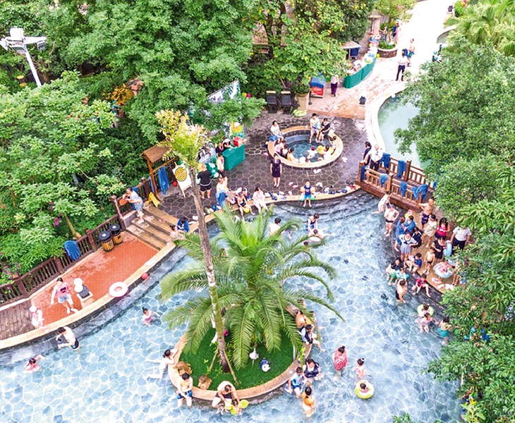 麓棠温泉更是不可错过的打卡点。数十座露天汤池依山势错落分布,有的藏身于婆娑竹影间,有的倚靠山石坐拥青峦。这里的温泉属天然医疗热矿泉,水质滑腻、洁净无染,富含偏硼酸、偏硅酸等多种对人体有益的矿物质,是迄今为止世界上最珍稀的天然小苏打型温泉之一。氤氲的泉雾中,游客可尽情舒展身心,体验“山水为药,时光为方”的深度养生之旅。草坪上,“无事来泡汤”系列活动精心设置了亲子手工、水上游乐、户外研学、露天电影、livehouse音乐演出、火锅烧烤等丰富项目,游客可沉浸式感受“无事自得”的松弛与惬意。